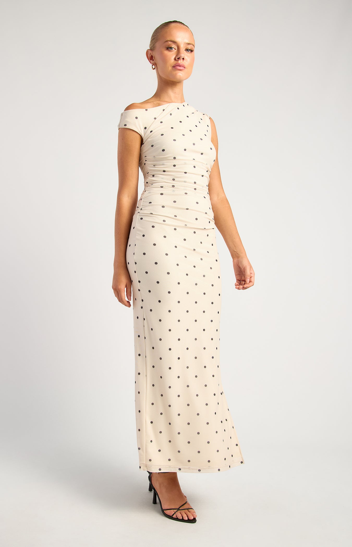 Meet your new “yes to every invite” dress. The Mirabelle Polkadot Mesh Midi Dress is the perfect balance of sultry and sophisticated, with an asymmetric neckline, body-hugging mesh, and timeless polkadots. Whether it’s a cocktail night, rooftop party or stylish dinner date, this one-shoulder stunner brings the drama—in the best way.
