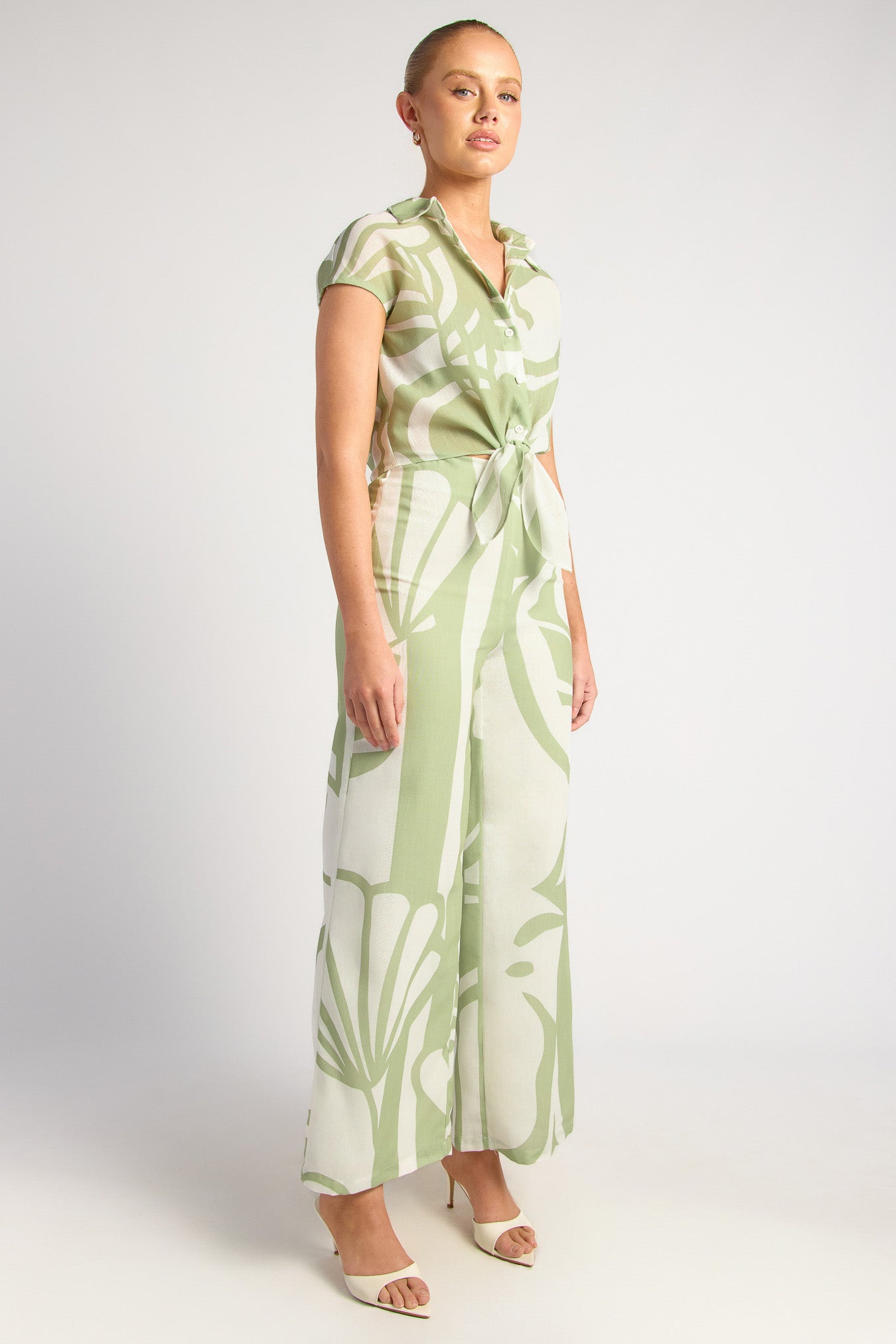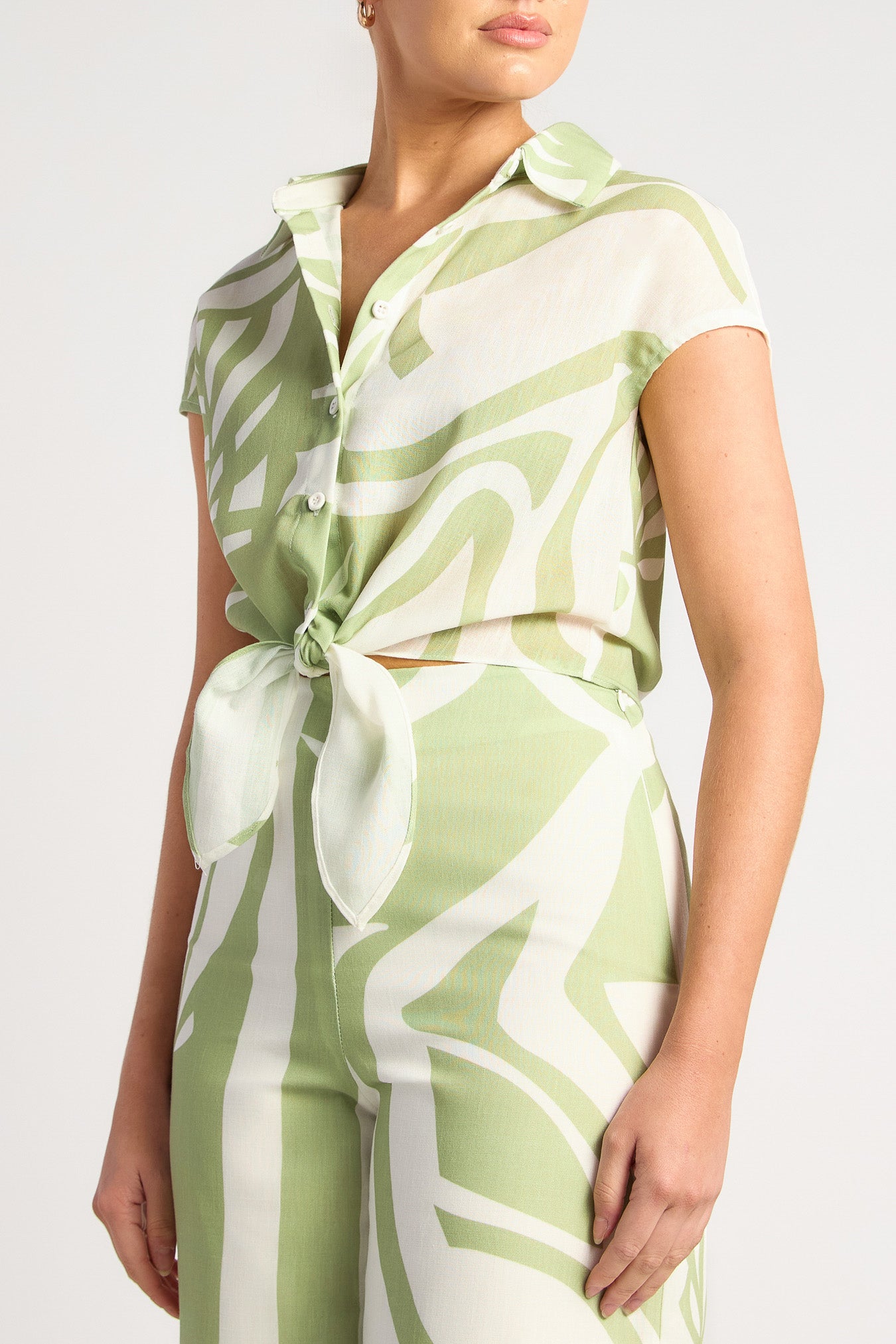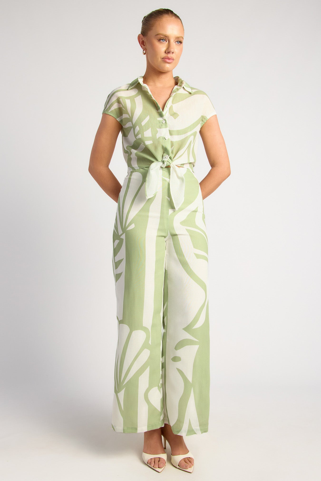 Sun-drenched days and balmy nights are calling — and the Chapel Set is answering. With a bold abstract print, effortless wide-leg pants and a tie-front crop shirt, this two-piece brings major jet-set energy. Wear it as a full look or mix and match — either way, it’s a statement.