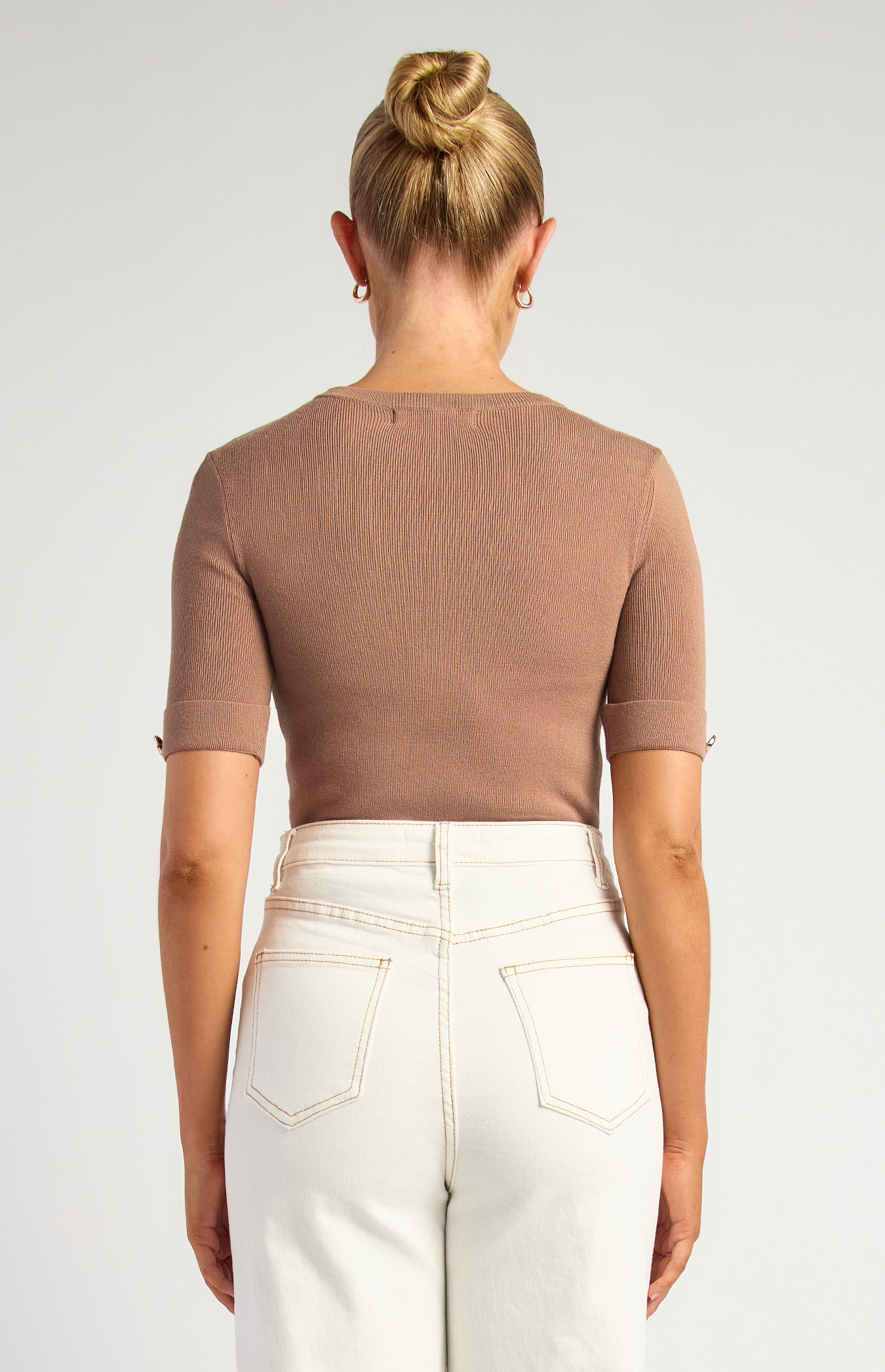 Clean, classic, and effortlessly refined—the Marion Short Sleeve Knit Top is your go-to for elevated everyday styling. Designed in a soft mocha ribbed knit, this fitted silhouette contours beautifully while offering all-day comfort. Finished with subtle gold-tone button detailing on the sleeves, it’s the perfect balance of minimal and luxe.
