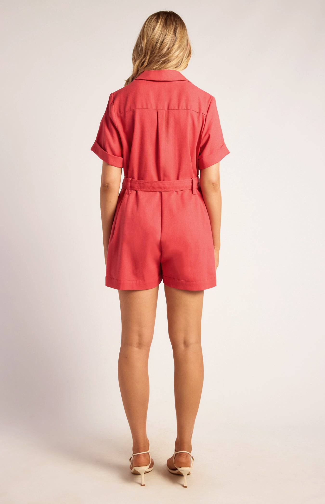 Structured, sleek, and seriously cute ā the Toby Playsuit is your shortcut to looking put-together with zero effort. Featuring a tailored collared neckline, flattering cinched waist, and standout gold buckle, this fiery piece is made to command attention. Desk to drinks? Done.