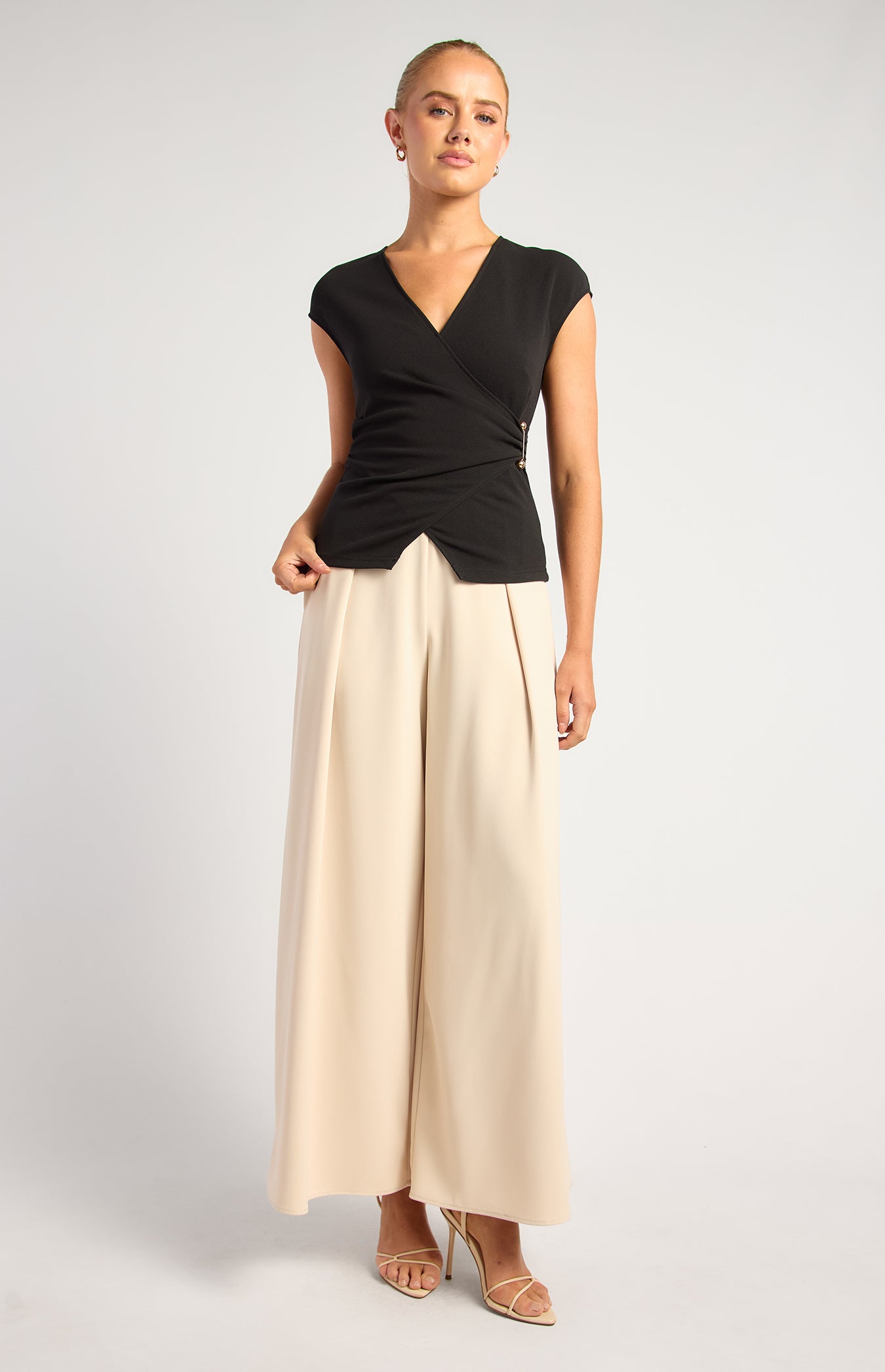 Minimal with a twist—literally. The Daria Short Sleeve Top brings elevated vibes to your everyday wardrobe with a wrap-style silhouette, sculpting fit, and gold hardware that pulls the whole look together. Soft, stretchy, and super flattering, this neutral essential takes you from desk to drinks without skipping a beat.