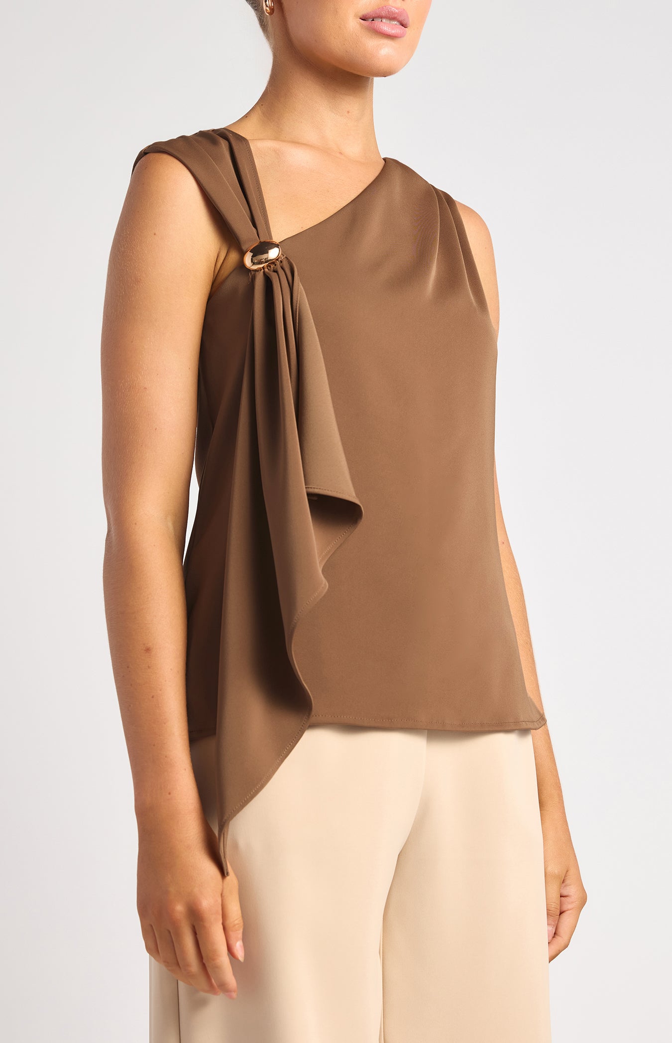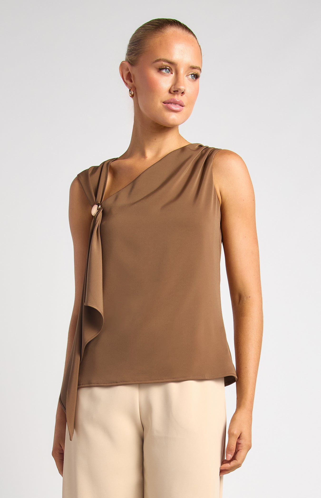 Soft, sophisticated, and beautifully detailed—the Ilona Top is where modern elegance meets timeless style. Designed in a rich chocolate hue, this sleeveless silhouette features a flattering asymmetric neckline and a statement draped panel secured with a gold-tone ring detail. It’s polished yet fluid, making it the perfect piece to elevate your everyday tailoring or dress up for evening plans.